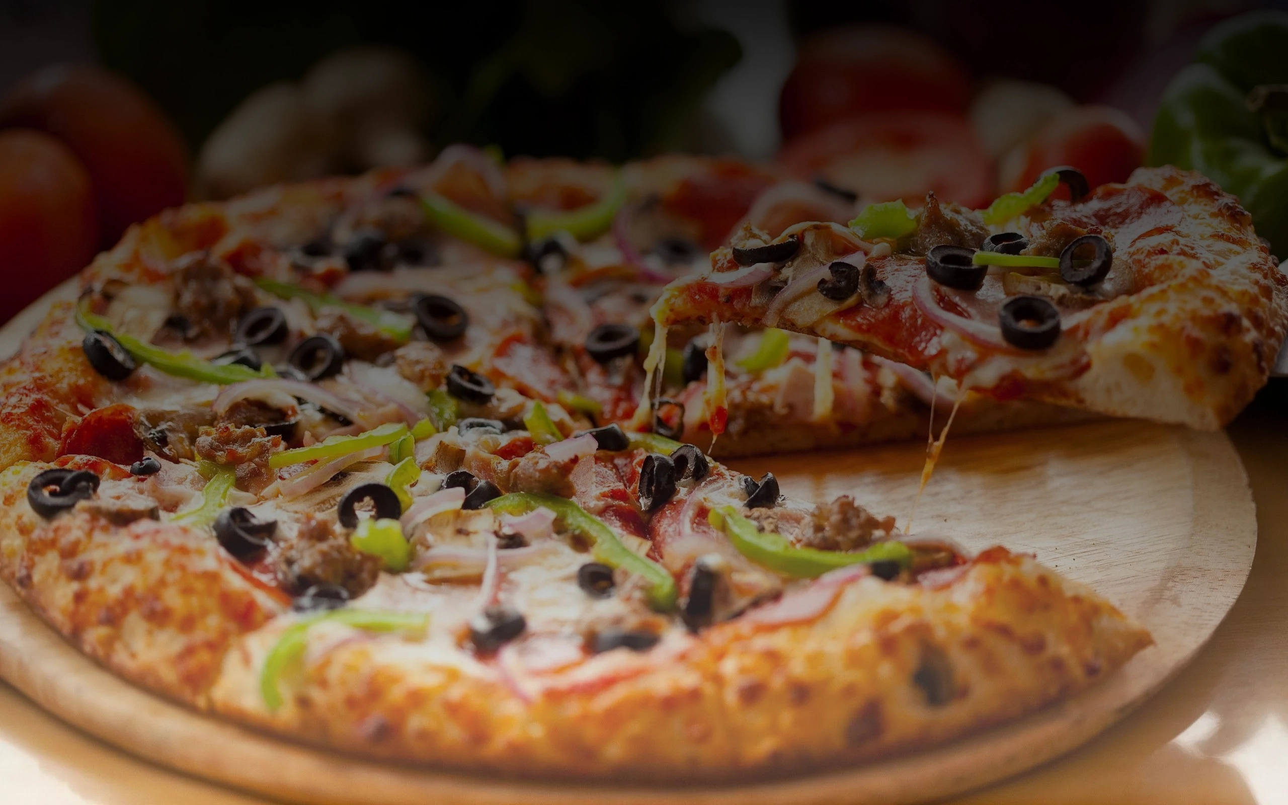 Veggie pizza bursts with fresh bell peppers, mushrooms, onions, and olives atop tangy tomato sauce and melted cheese for a colorful, healthy delight.